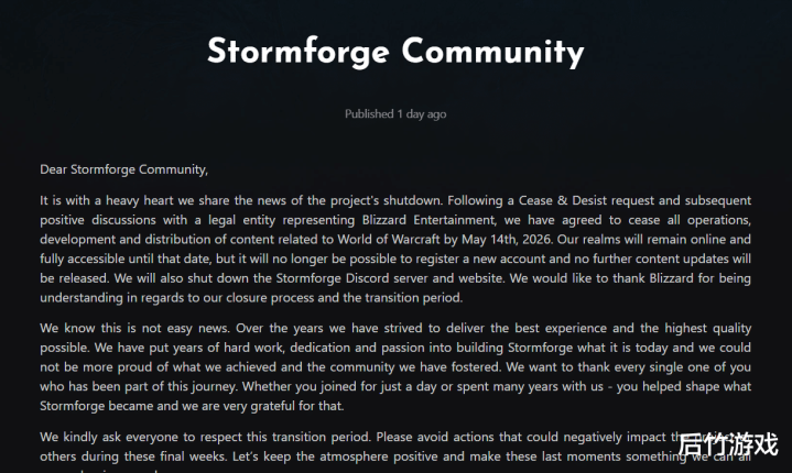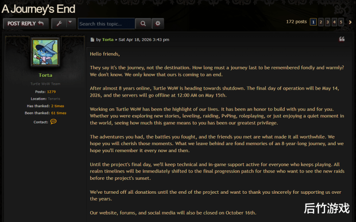 在暴雪取得讼事之后,乌龟服(Turtle WoW)的运营团队在4月18日发表公告,郑重秘书乌龟服将在5月15日关服。而Stormforge“荷兰服”也在同期发布公告,秘书了停服音信。 原贴: