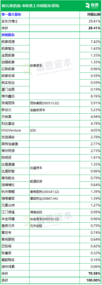 股东架构 招股书线路,戒指2025年9月5日,新元素药业在香港上市前的股东架构中,史东方博士,执股29.41%,为单一最大股东。 其他投资者包括凯泰成本、丽珠集团(000513.SZ)、金融街成本、红杉、高特佳、达晨成本、乾谈投资、泰格医药(300347.SZ)、康哲药业(00867.HK)、倚锋创投、华金成本(000532.SZ)、元禾控股等。