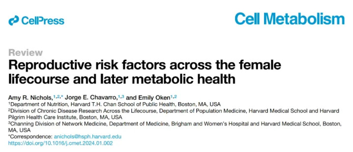 图源:CMT 女性生殖特征与代谢健康的潜在关联,当前研究的瓶颈与突破 在内分泌领域的研究前沿,女性生殖特征与代谢健康的深层关联正吸引越来越多的关注。尽管传统研究多聚焦于肥胖、胰岛素抵抗等常见危险因素,但女性生殖特征这一关键维度却常被忽视。然而,近期研究逐渐揭示,初潮年龄、月经周期规律性、多囊卵巢综合征(PCOS)、妊娠期体重变化、妊娠期糖代谢异常以及更年期症状等生殖特征,可能不仅是代谢紊乱的早期预警信号,还可能直接参与代谢疾病的长期发展。这些特征与代谢疾病之间的关系复杂且多元,可能涉及共享的上游病因或因果机制。然而,这一领域的研究仍面临诸多挑战。现有研究多为观察性研究,难以明确因果关系,且对生殖特征与代谢疾病相互作用的分子机制了解有限。此外,如何将这些研究发现转化为临床实践中的早期干预策略,仍是需要解决的关键问题。在临床实践中,代谢疾病的管理一直存在诸多局限。常用的生活方式干预虽安全但依从性差,药物治疗虽起效快但长期副作用和费用问题突出。更重要的是,这些治疗多在疾病确诊后实施,往往已错过最佳干预时机。若能在疾病早期甚至代谢紊乱尚未明显表现时,依据女性生殖特征进行精准干预,有望更有效地降低代谢疾病风险。 2024年2月,Cell Metabolism杂志发表了一篇题为“Reproductive risk factors across the female lifecourse and later metabolic health”的文章,为这一领域带来了新的曙光。该研究系统回顾了女性生殖特征与代谢健康的关联,深入挖掘这些特征作为未来代谢疾病风险标志物的潜力,并探索其潜在的分子机制。研究涵盖了从青春期到更年期的各个生殖阶段,将这些生殖特征与2型糖尿病(T2DM)、血脂异常等代谢疾病的风险紧密联系起来,为临床实践中的早期干预提供了新的思路和理论依据。