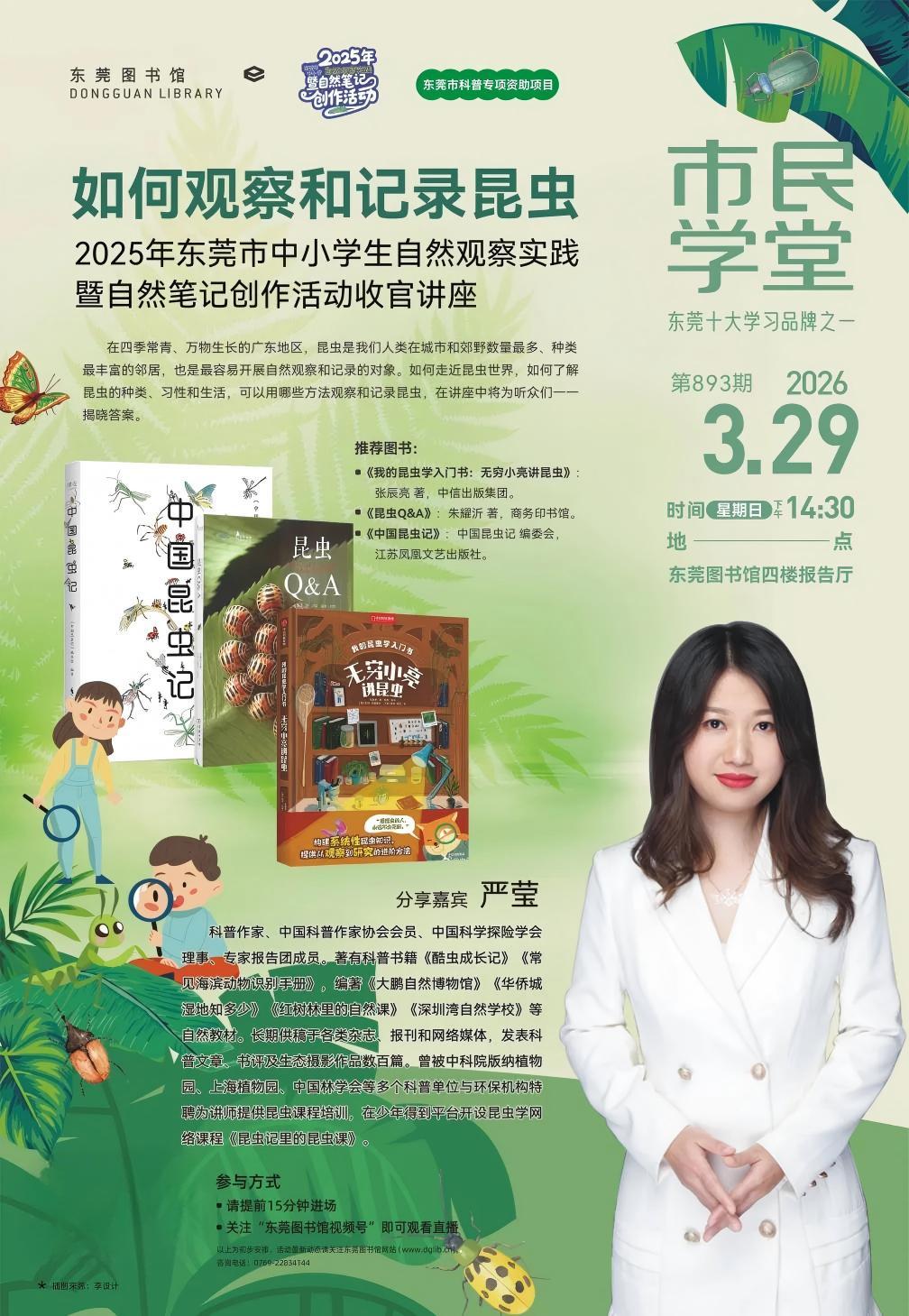 3月29日(周日)14:30,东莞藏书楼把“虫豸课堂”搬进了阐述厅:科普作者严莹敦厚带来《怎样不雅察和记载虫豸》讲座,把“追虫的乐趣”和“记载的手段”,一次性教给你和孩子。