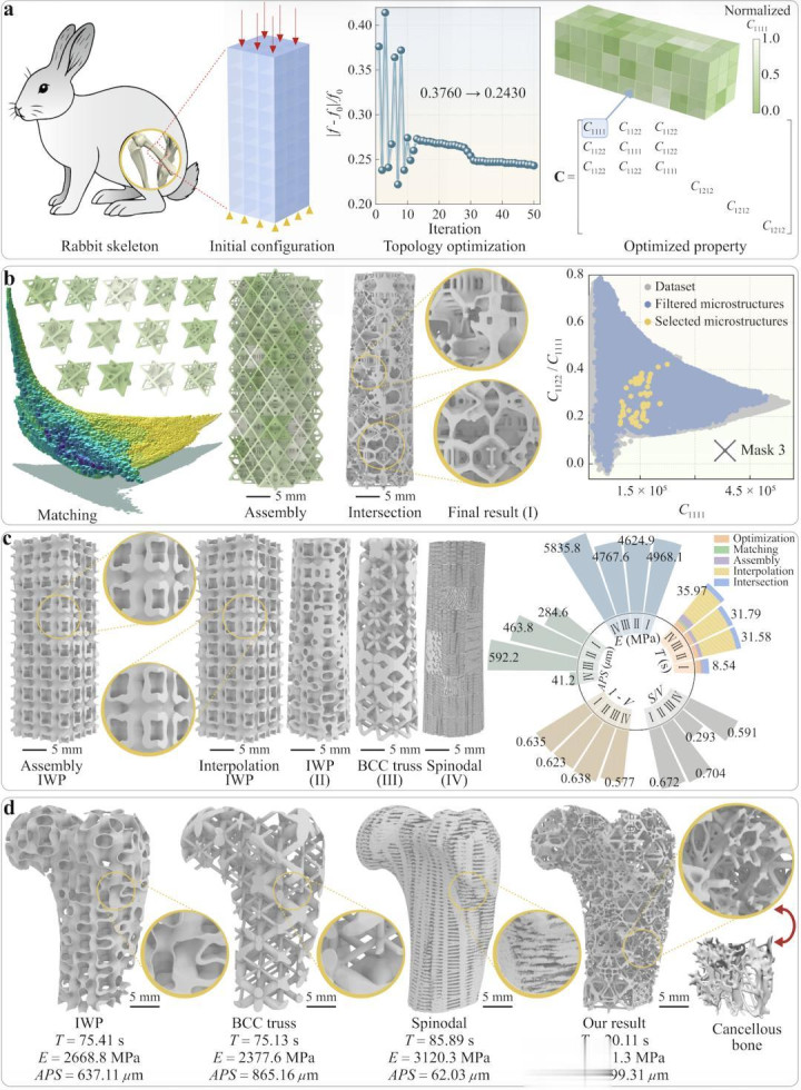 图 2 在四种不同边界(Mask 1–4)条件下的 L-BOM 数据集示意图。 a–c 为第一种边界条件(Mask 1)的构建流程: a 基于 Mask 1 通过优化生成的初始数据集(21,620 个微结构); b 主动学习(AL)框架; c 经过主动学习后的掩膜 1 最终数据集(106,445 个微结构)。 d–f 为其余三种边界(Mask 2–4)的初始与最终 L-BOM 数据集。 蓝色箭头表示多轮主动学习过程。 多尺度逆向设计闭环:效率提升 128 倍 在多尺度逆向设计闭环中,研究团队以股骨植入物为代表性案例,采用 “自上而下” 的多尺度逆向设计流程,实现了结构性能与生物特征的高度协同匹配。设计结果在多个关键指标上与天然骨组织高度一致:在杨氏模量、孔径和孔隙率等参数上实现精准匹配,并在刚度、渗透性与轻量化之间取得了更优平衡;在结构形态上,自然形成兼具致密骨板状特征与松质骨桁架状特征的多尺度复合结构。 {jz:field.toptypename/}与 IWP、BCC 桁架及旋节线等经典结构设计方法相比,该方法无需后期插值或额外拼接处理,整体计算效率显著提升,且所生成结构在形态与层级特征上更接近真实骨组织,体现出显著的设计优势。