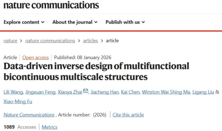 近日,中国科学技术大学(USTC)联合新疆师范大学、中关村人工智能研究院、香港理工大学,在数据驱动的多功能双连通多尺度结构逆向设计领域取得重要突破。相关成果于 2026 年 1 月 8 日以 “Data-driven Inverse Design of Multifunctional Bicontinuous Multiscale Structures” 为题,发表于 Nature 旗下顶级综合期刊 Nature Communications。 该研究首次系统性解决了双连通多尺度结构长期存在的 “难描述、难设计、难制造” 核心瓶颈,为骨植入物、渗透器件、力学隐身结构等复杂工程系统的智能化设计提供了全新的数据驱动范式。