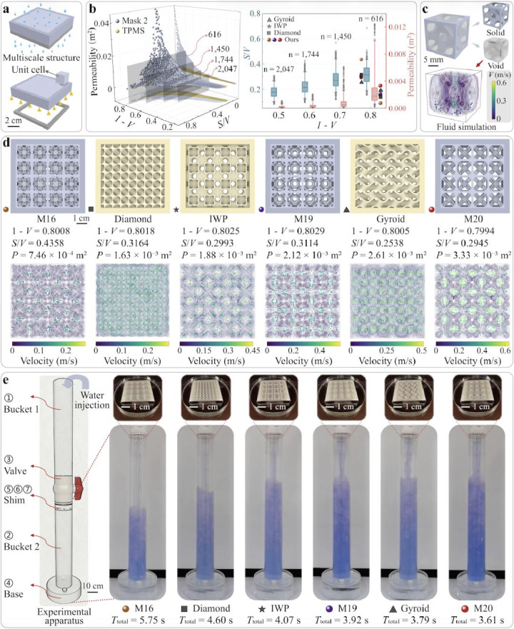 图 4 机械斗篷(20 × 20 × 20 单元)逆向设计结果。右侧展示了优化过程的迭代曲线,以及用于填充隐身体的微结构的性能分布。 128 倍并非终点,而是多尺度结构设计走向规模化应用的起点。 可调渗透结构:从仿真到实验高度一致 研究团队还设计并制造了 4×4×1 双连通多尺度过滤结构,并对其流体性能进行了系统验证。结果表明,基于 L-BOM 数据集构建的结构在渗透率和比表面积(S/V)等关键指标上显著优于传统 TPMS 结构(如 Gyroid、Diamond 和 IWP)。同时,数值计算、仿真分析与实验测量结果高度一致,在高孔隙率样品中,实测流速与数值预测几乎完全重合,验证了该方法在保持整体双连通性的同时,能够实现对流体通道结构的精确调控,显示出在过滤与流体调控器件中的应用潜力。