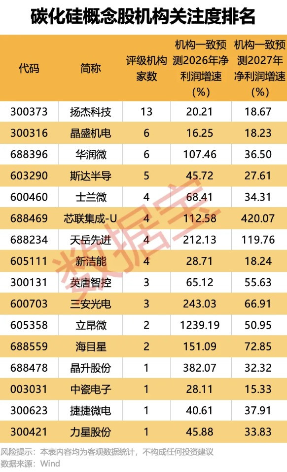 碳化硅用于先进封装,主要为科罚GPU芯片高散热问题。此前有媒体报说念称,英伟达联想在其新一代Rubin处理器的斥地蓝图中,将CoWoS先进封装秩序的中介层材料,由硅换成12英寸碳化硅衬底,破解Rubin平台1000W功耗与高密度Chiplet封装的热管制、结构可靠性、互连密度三大瓶颈,最晚将在2027年导入。 第三代半导体中枢材料 {jz:field.toptypename/}碳化硅看成第三代半导体的中枢代表,比较于硅,具有10倍的击穿电场强度、3倍的禁带宽度、2倍的极限责任温度、2倍的实足电子漂移速度、3倍的热导率。凭借其专有的材料特质,碳化硅正逐步突破传统硅基半导体的性能瓶颈,成为新动力汽车、光伏储能、AI算力、高端工业等畛域的要害中枢材料。 集微商讨发布的《2025中国第三代半导体行业上市公司斟酌汇报》泄漏,2024年人人碳化硅功率半导体器件阛阓为26亿好意思元,展望到2029年人人销售额有望达到136亿好意思元,年复合增长率展望为39.9%。 据证券时报·数据宝统计,A股碳化硅意见股有20余只,当今已有14家公司发布2025年岁迹数据,但举座事迹弘扬欠安,其中失掉公司达到7家,事迹增长的公司仅士兰微、温州宏丰、维科精密等少数几家。 事迹下滑的原因,主若是国内碳化硅阛阓竞争是非。天岳先进在事迹预报中示意,国内碳化硅衬底行业阛阓竞争加重,公司为扩大阛阓占有率、安祥行业地位推论阶段性阛阓战术调度影响,居品平均销售价钱下落,最终导致公司举座营收畛域同比下滑。 从机构评级来看,有16股获取机构体恤,扬杰科技、晶盛机电、华润微、斯达半导等体恤机构数目居前,均在5家及以上。 立昂微、天岳先进、海目星、晶升股份等最获看好,机构一致预测往时两年岁迹增速均值超100%。