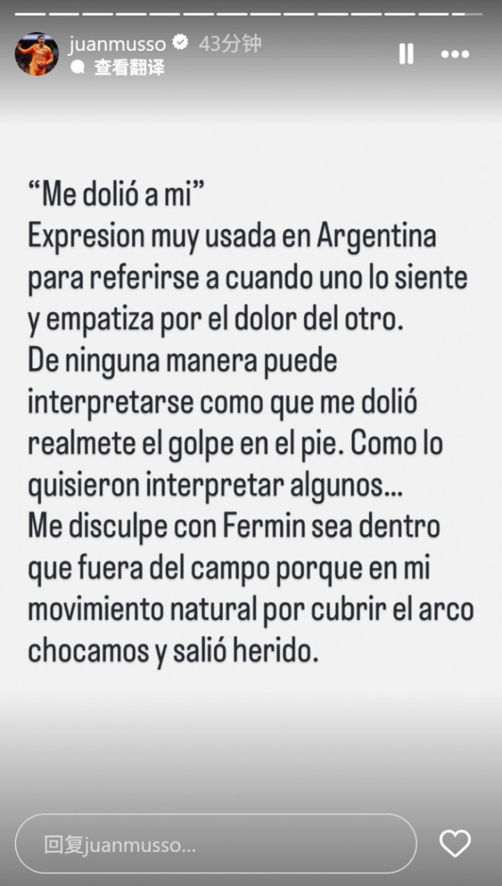 穆索写说念:“不教而诛”—这是一句在阿根廷常用的抒发米兰体育官网,milansports用来神情一个东说念主对别东说念主的祸殃感到怜悯和调节,这句话统共不成被扭曲为我的脚确凿受伤了。就像有些东说念主试图解读的那样......我在场上和场下齐向费尔明说念歉了,因为在我当然挪动以保护球门时,咱们发生了碰撞,这导致他受伤。 雅博体育app下载中国官网入口